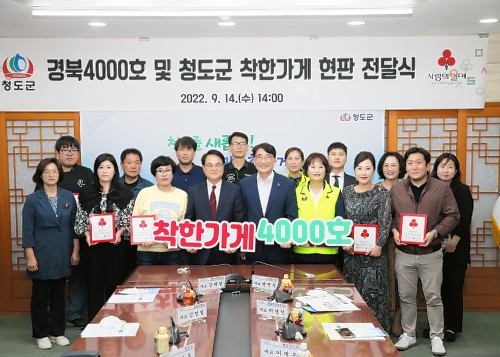 청도군과 경북사회복지공동모금회는 지난 14일 경북 착한가게 4000호점 및 청도군 신규 착한가게 현판 전달식을 가졌다.