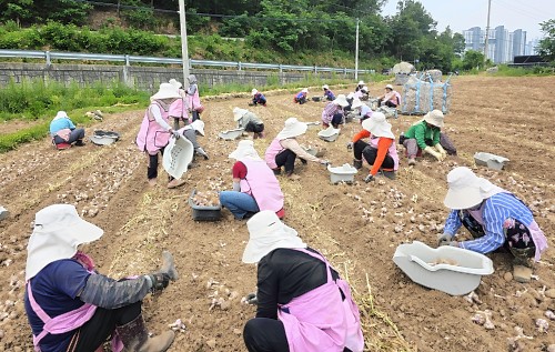 | ↑↑ 생활개선달성군연합회는 2일 유가읍 초곡리 마늘밭에서 일손 돕기를 실시했다. [달성군 제공] |