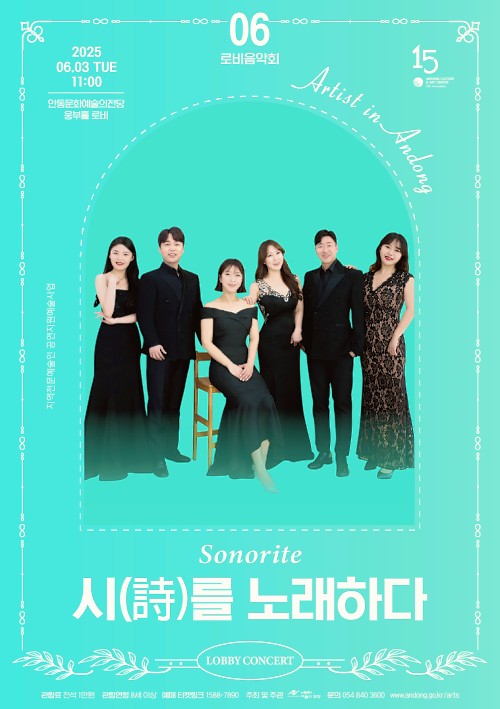 안동문화예술의전당 로비음악회 ‘소노리떼-시를 노래하다’는 전석 1만원으로 50석 한정 판매된다. 자세한 사항은 전화(☎054-840-3600)로 문의하거나 안동문화예술의전당 누리집(http://www.andong.go.kr/arts)에서 확인할 수 있다.