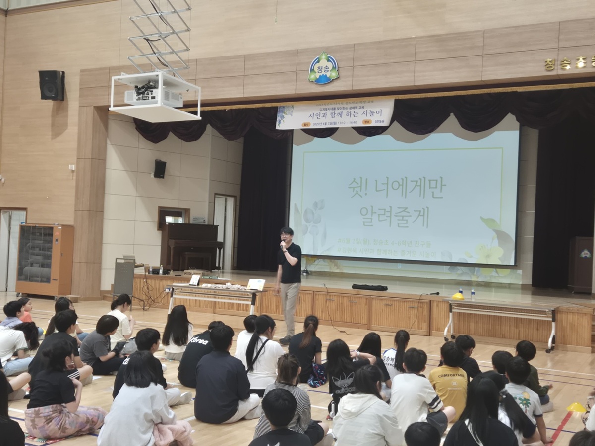 청송초등학교는 학생들의 문해력 향상과 감성 교육을 위한 일환으로 지난 2일, 4~6학년 학생들을 대상으로 지역 시인이자 황남초등학교 교감인 김현욱 시인을 초청해 특별한 시 교육 프로그램인 ‘시인과 함께 하는 시놀이’를 운영했다.