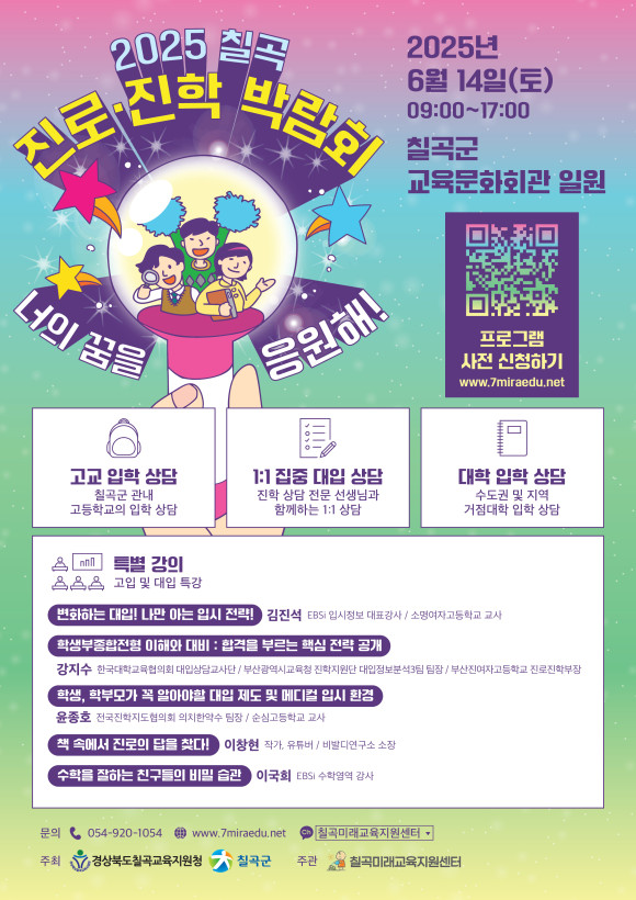 칠곡교육지원청과 칠곡군이 주최하고 칠곡미래교육지원센터가 주관하는 ‘2025 칠곡 진로·진학 박람회’(이하 박람회)가 이번달 14일 칠곡군교육문화회관에서 열린다.