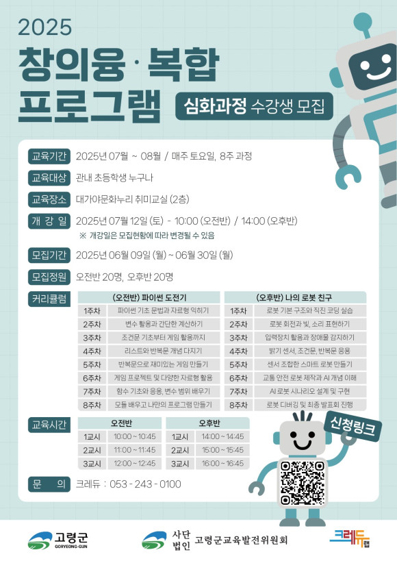 이남철 군수는 “이번 창의융‧복합 프로그램 심화과정은 단순 체험을 넘어, 문제 해결력과 융합적 사고를 기를 수 있도록 전문 강사와 함께 구성된 실습 중심 프로그램”이라며 “학생들에게는 미래 사회를 준비할 수 있는 소중한 기회가 될 것”이라고 전했다.