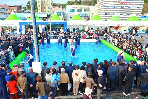 | ↑↑ 울진의 가을은 다채로운 축제와 풍성한 볼거리로 관광객들을 맞이한다. 사진은 죽변항 수산물축제 맨손활어잡기 체험. [울진군 제공] |