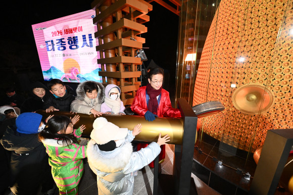| ↑↑ 경북도는 2026년 병오년 5대 도정방향으로 ‘살맛 나는 경북시대’를 만들겠다는 의지를 드러냈다. 사진은 지난달 31일 밤 도청 원당지에서 어린이들과 타종하는 이철우 도시자 모습. [경북도 제공] |