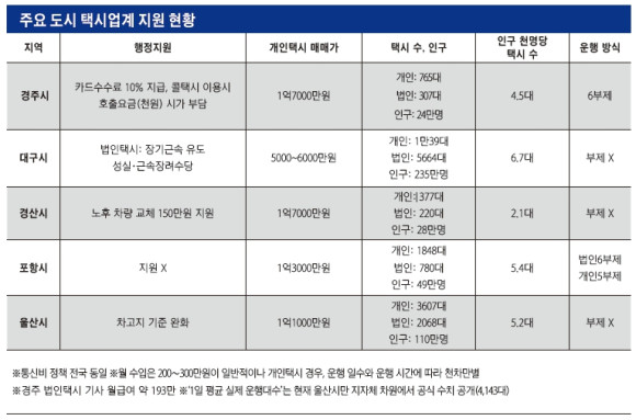 인근 주요 도시의 택시업계 현황(표 참조)을 살펴보면 이러하다.