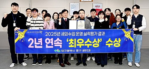 대구 동구청이 행정안전부 주관 2025년 지방세외수입 운영실적 분석·진단평가에서 2년 연속 ‘최우수상’을 수상했다.