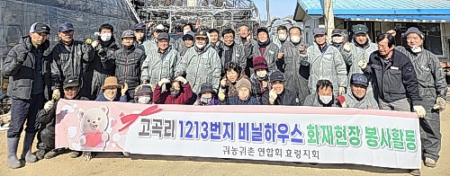 군위군 효령면 귀농귀촌연합회, 효령사랑회, 고곡2리 주민 40여명은은 지난 26일 고곡리 화재 피해 현장을 찾아 비닐하우스 철거 및 정비 봉사활동을 실시했다. 봉사단은 농장주와 사전 협의를 거쳐 현장을 방문해 하우스 내 보온커튼 및 불에 탄 부직포 철거 작업을 진행하고, 내부에 남아 있던 각종 기자재를 정리하는 등 복구를 위한 기초 정비 작업을 실시했다. [군위군 제공]