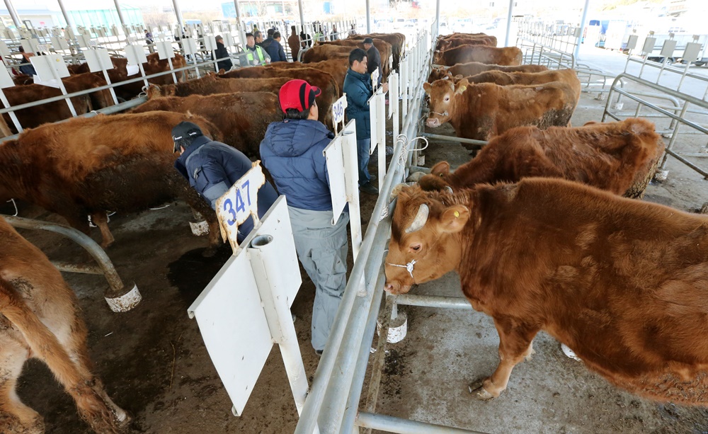 | ↑↑ 12일 오전 영천의 가축시장에서 경매가 이뤄지고 있다. 경북도는 전국적으로 번진 구제역으로 지난달 14일부터 영천 가축시장의 거래를 정지했지만 설을 맞아 한우농가의 경제적 어려움을 해소하고자 임시 개장했다. |