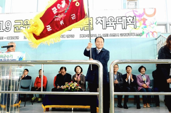 | ↑↑ 김영만 군위군수가 지난 2~3일 군위군수기 종목별 체육대회를 방문해 개막을 알리고 있다. |