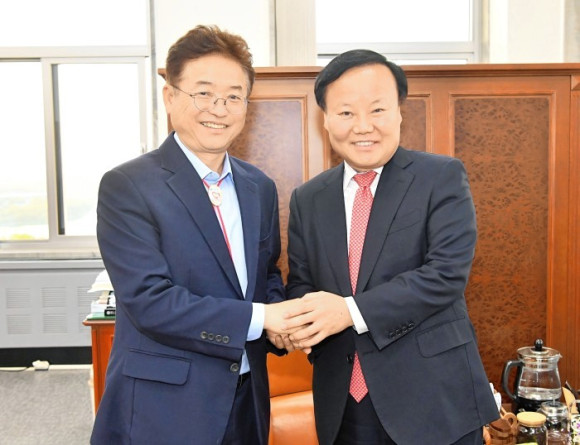 | ↑↑ 이철우 경북도지사(왼쪽)가 국비 확보를 위해 국회를 방문, 김재원 예결위원장을 만나 악수를 나누고 있다. |