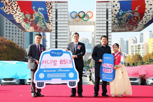 | ↑↑ 한국수력원자력이 7일 서울 올림픽공원 평화의 광장에서 2019년도 행복더함 희망나래 차량 전달식을 진행하고 있다. |
