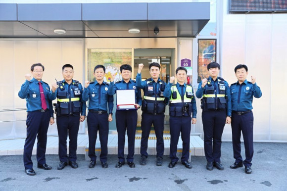| ↑↑ 3분기 베스트 순찰팀에 선정된 의성지구대 순찰 3팀이 기념촬영을 하고 있다. |